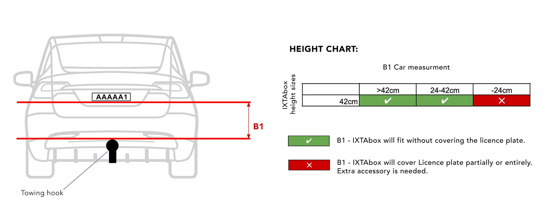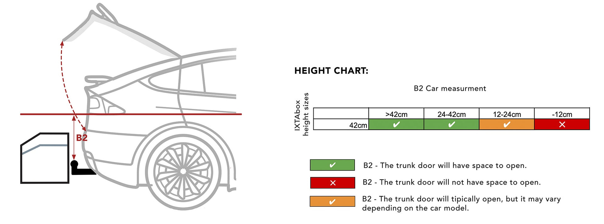 Most medium to large cars - independent of brand - are tall enough for all IXTAbox heights. However, to confirm you are able to open the back door, you can take a single measurement.