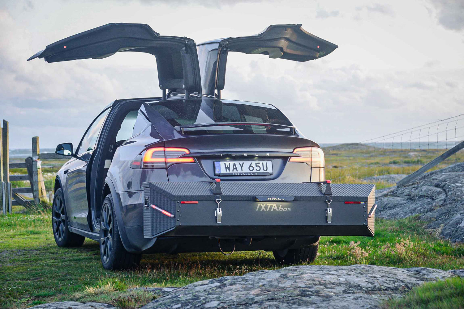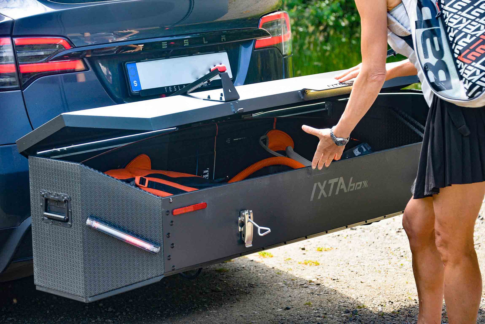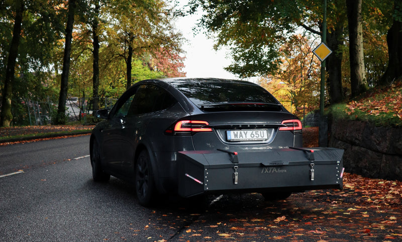 Because it sits behind the car instead of on the roof, IXTAbox Pro creates less aerodynamic drag than a traditional roof box. This can help reduce fuel consumption and preserve electric range compared to roof-mounted cargo solutions.